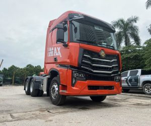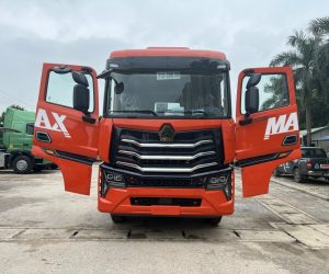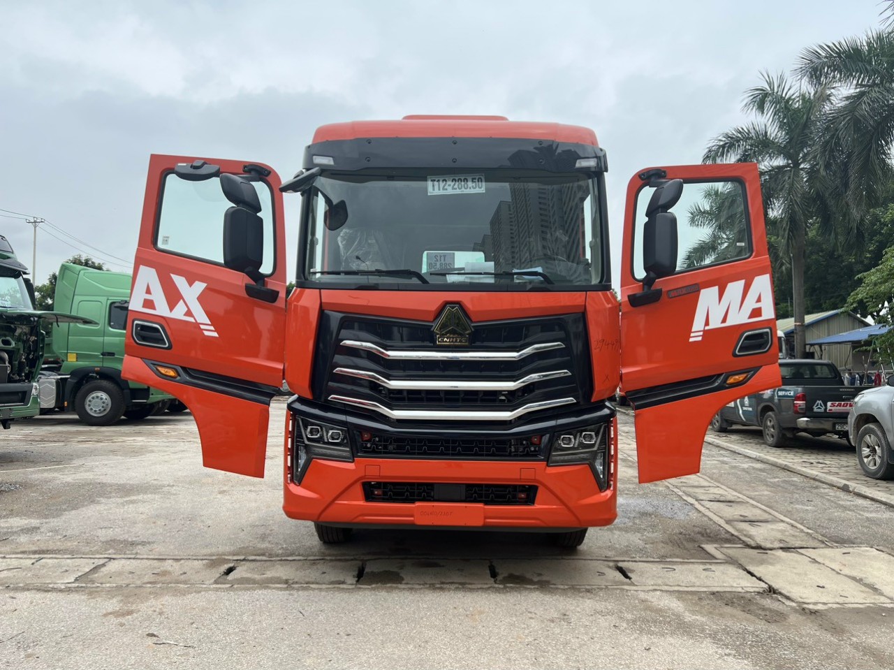 - Cabin của đầu kéo Howo MAX 440Hp cầu láp được thiết kế đặc biệt với mẫu Cabin Max-E, mang đến vẻ đẹp hầm hố và nổi bật. Hệ thống lưới tản nhiệt lớn với thanh ngang được mạ crom sáng bóng, kết hợp với logo HOWO phát sáng được đặt chính giữa, tạo điểm nhấn đặc biệt cho xe.